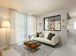 室内用窓:リクシル「デコマド」(リビングダイニング)室内に奥行のある開放的な空間を作ります。明かりを取り入れ、人の気配も感じられる空間。アクセント壁「ストーンスタイル」もぜひご覧ください。